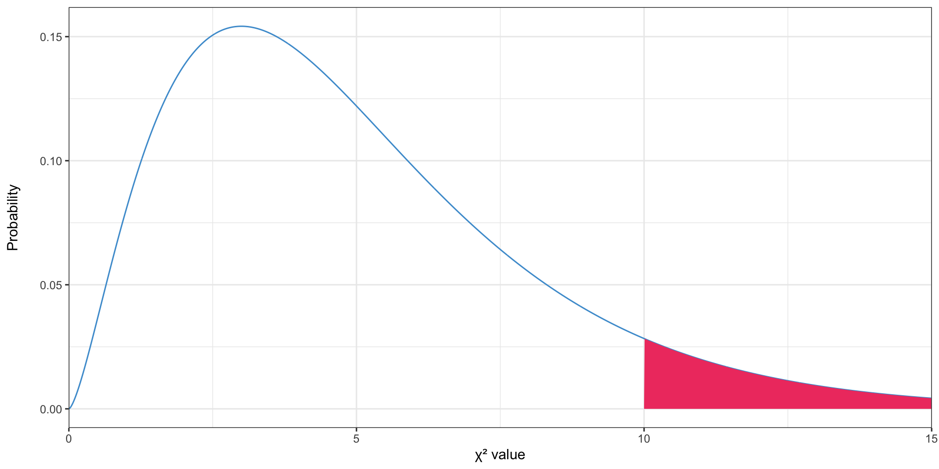 =(B5-B10)^2/B10=SUM(B13:D14)CHISQ.DIST to get the p-valueCHISQ.DIST.RT variant=CHISQ.DIST.RT(B18, 2): 0.324CHISQ.TEST function=CHISQ.TEST(actual, expected) where actual and expected are cell ranges